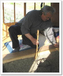 囲炉裏の灰はいつもきれいに整えておきます。